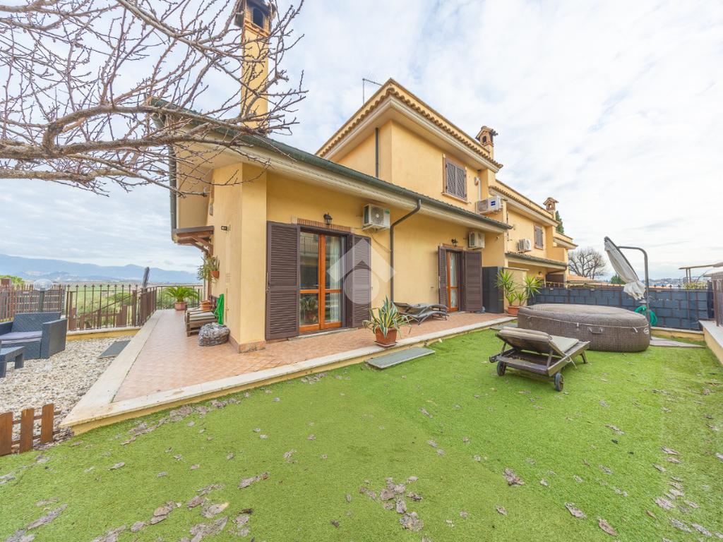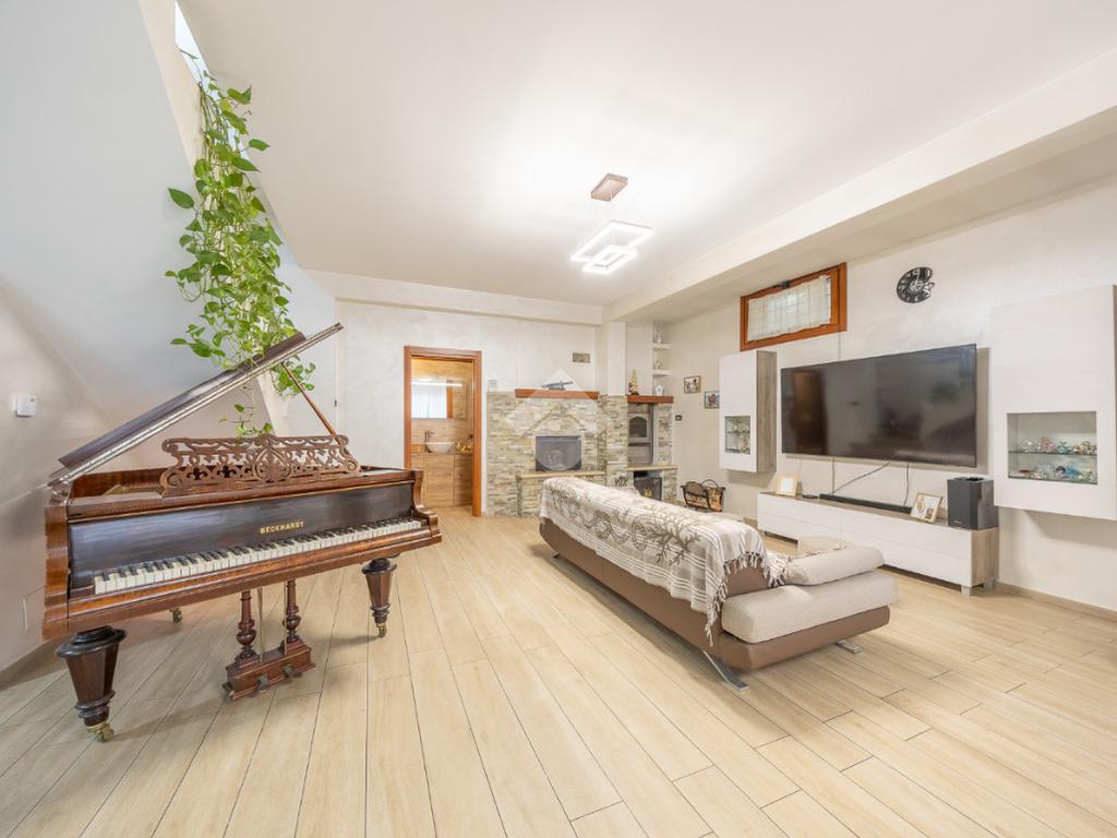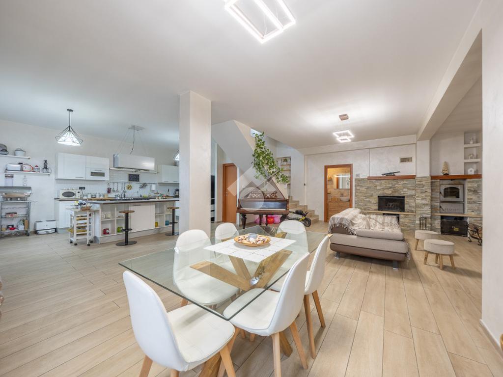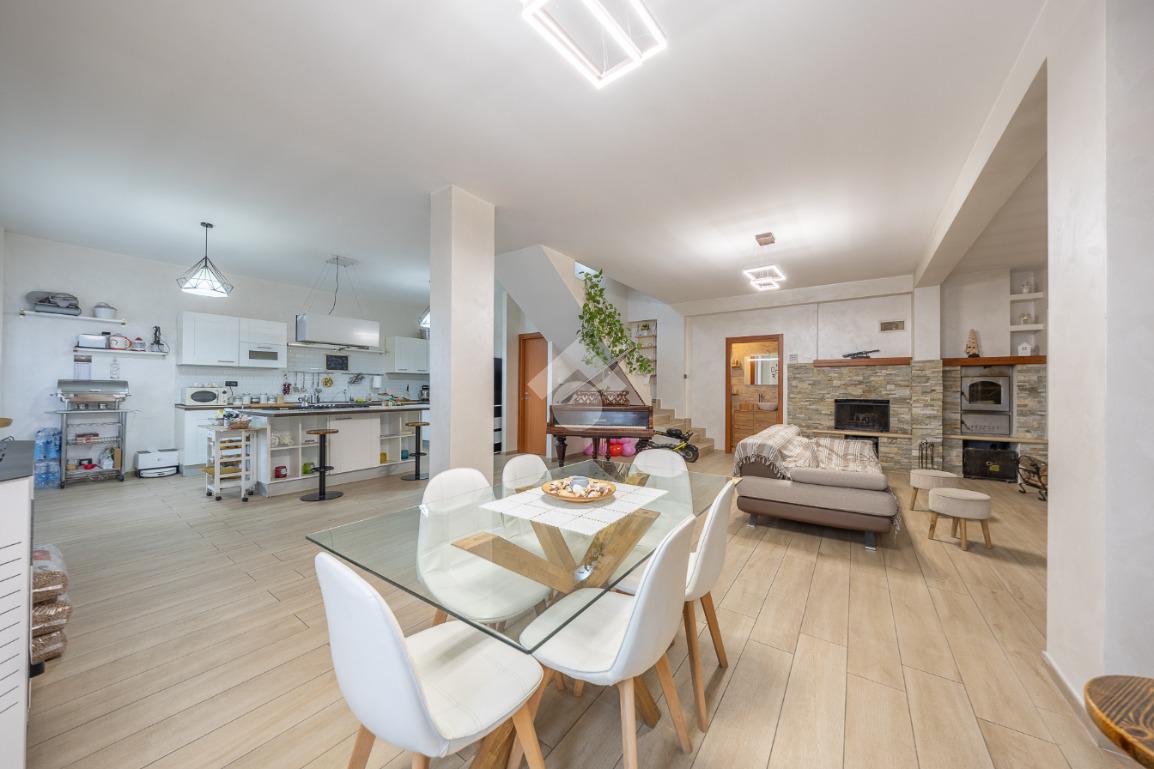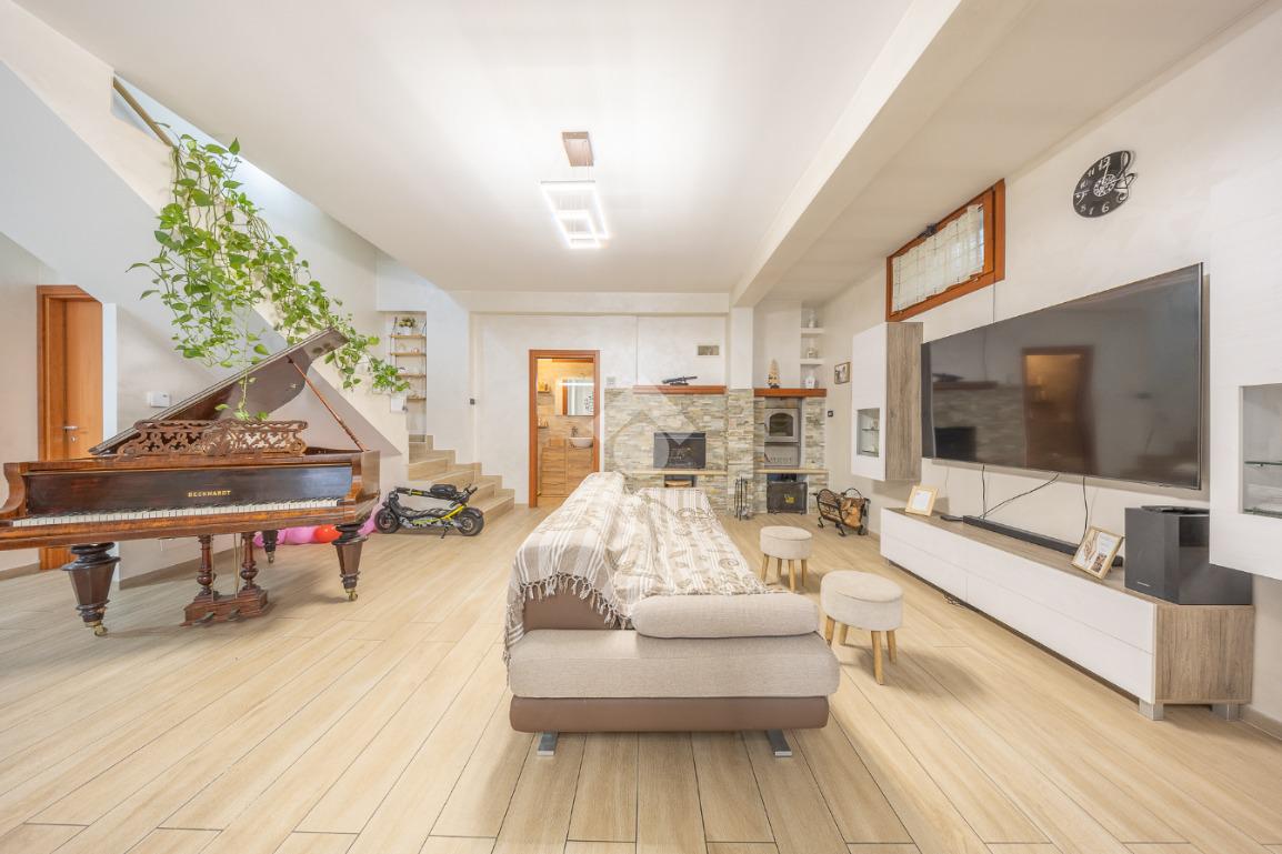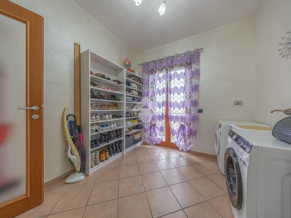 Salendo al piano terra, il cuore della villa si apre in un elegante salone con uscita sul giardino principale, un perfetto equilibrio tra verde e area mattonata, pensato per vivere l’esterno in ogni stagione. Un’ulteriore uscita conduce alla veranda, da cui si gode una vista mozzafiato sul paesaggio circostante, un vero angolo di quiete e bellezza. Il piano prosegue con una comoda lavanderia, una spaziosa camera matrimoniale con accesso diretto al giardino e un bagno completo, curato nei dettagli.