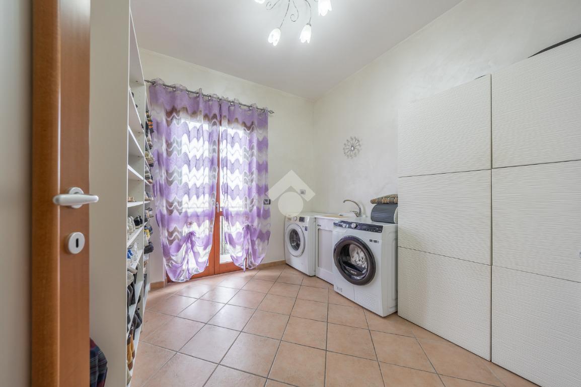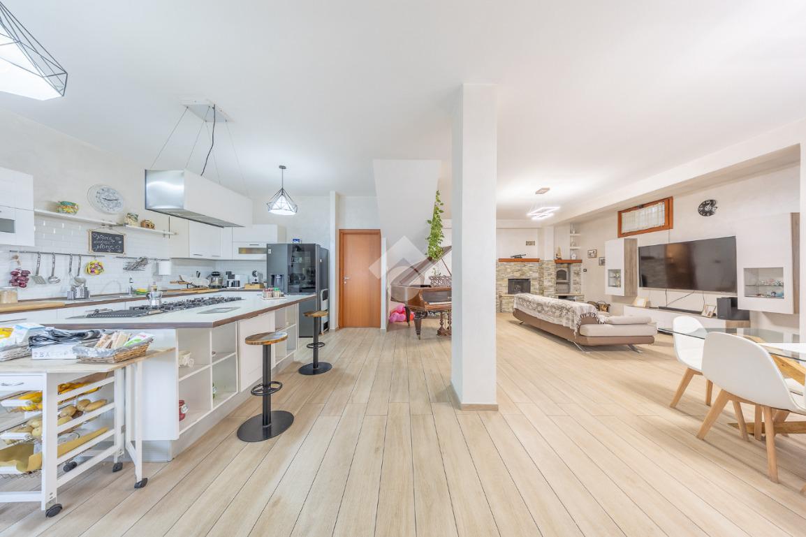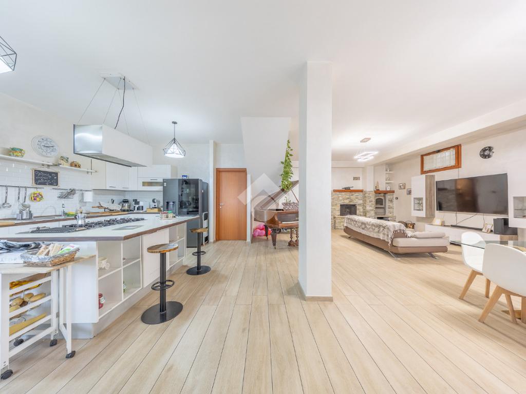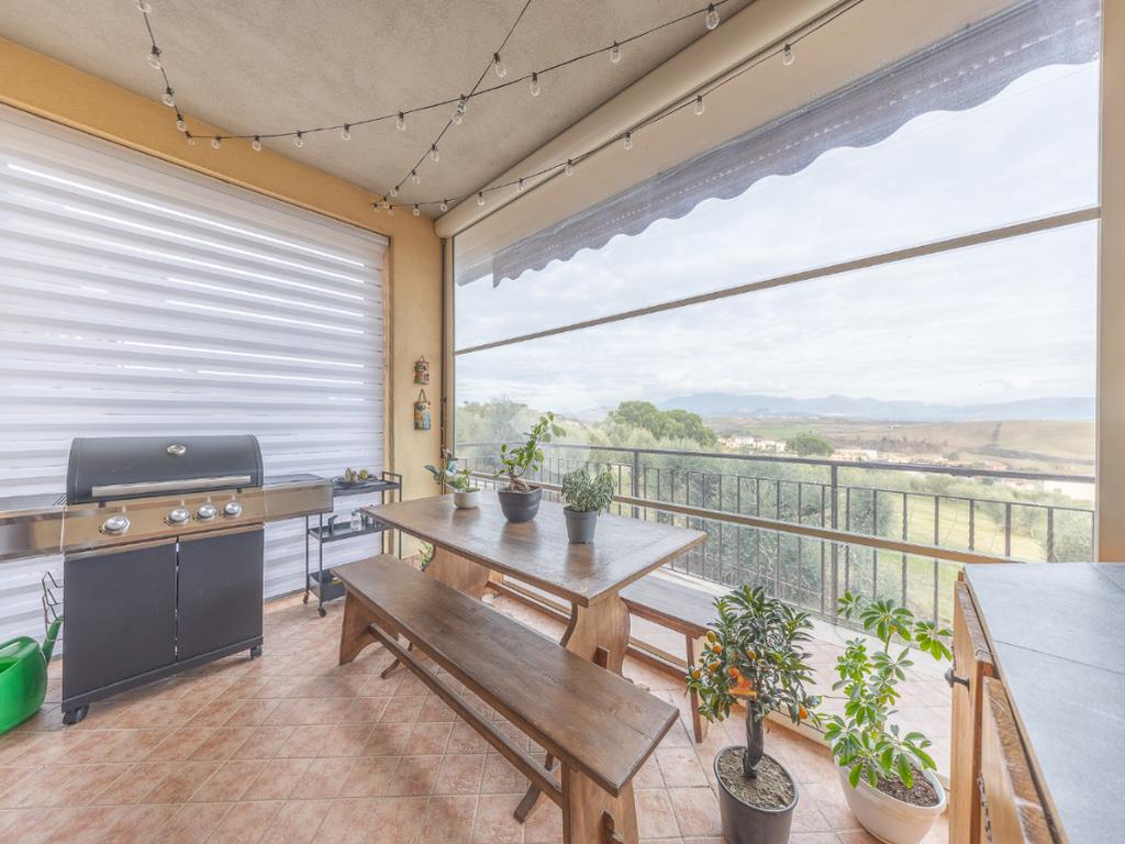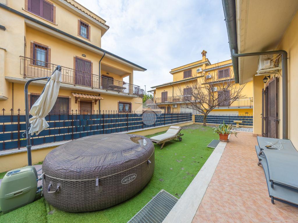Salendo al piano terra, il cuore della villa si apre in un elegante salone con uscita sul giardino principale, un perfetto equilibrio tra verde e area mattonata, pensato per vivere l’esterno in ogni stagione. Un’ulteriore uscita conduce alla veranda, da cui si gode una vista mozzafiato sul paesaggio circostante, un vero angolo di quiete e bellezza. Il piano prosegue con una comoda lavanderia, una spaziosa camera matrimoniale con accesso diretto al giardino e un bagno completo, curato nei dettagli.