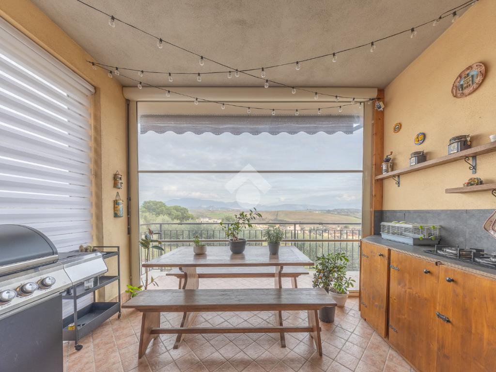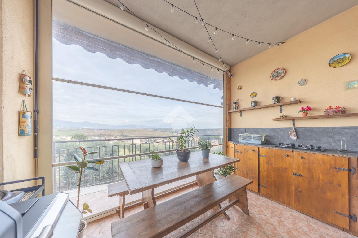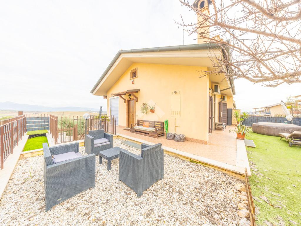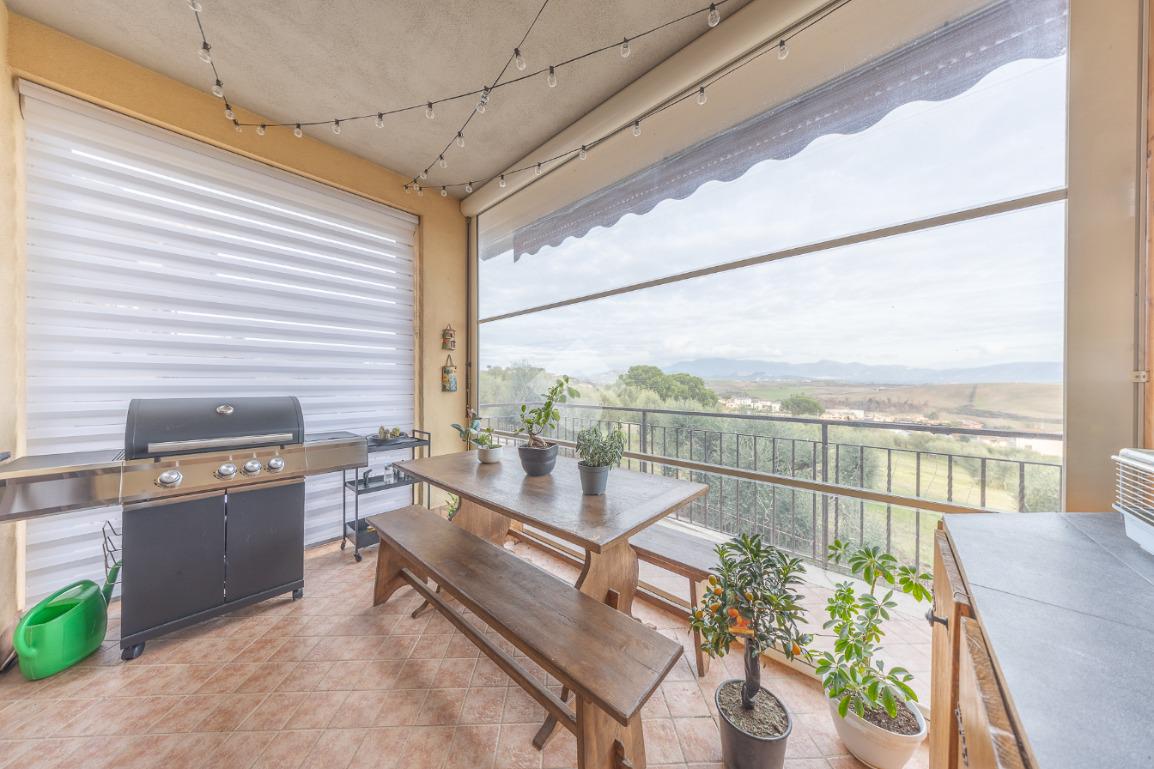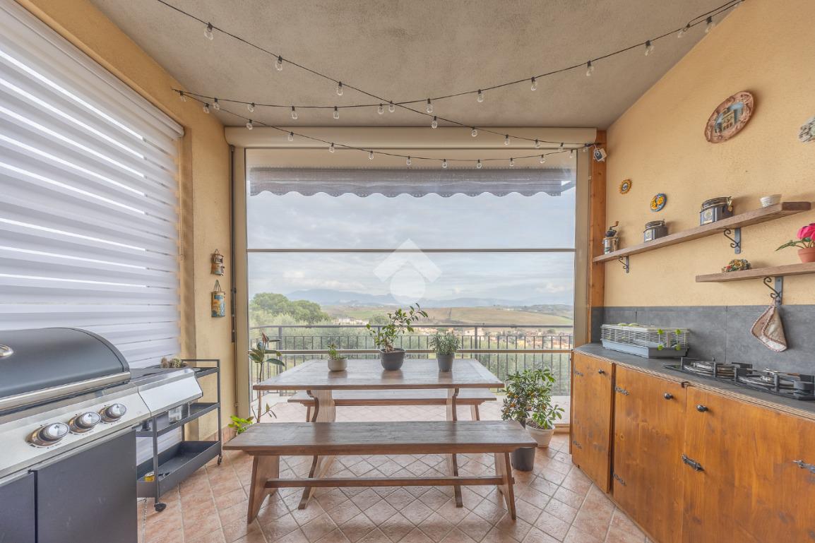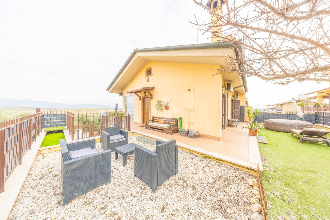 Salendo al piano terra, il cuore della villa si apre in un elegante salone con uscita sul giardino principale, un perfetto equilibrio tra verde e area mattonata, pensato per vivere l’esterno in ogni stagione. Un’ulteriore uscita conduce alla veranda, da cui si gode una vista mozzafiato sul paesaggio circostante, un vero angolo di quiete e bellezza. Il piano prosegue con una comoda lavanderia, una spaziosa camera matrimoniale con accesso diretto al giardino e un bagno completo, curato nei dettagli.